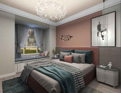 次臥采用高級灰+粉色,醞釀著這世間浪漫的語言。